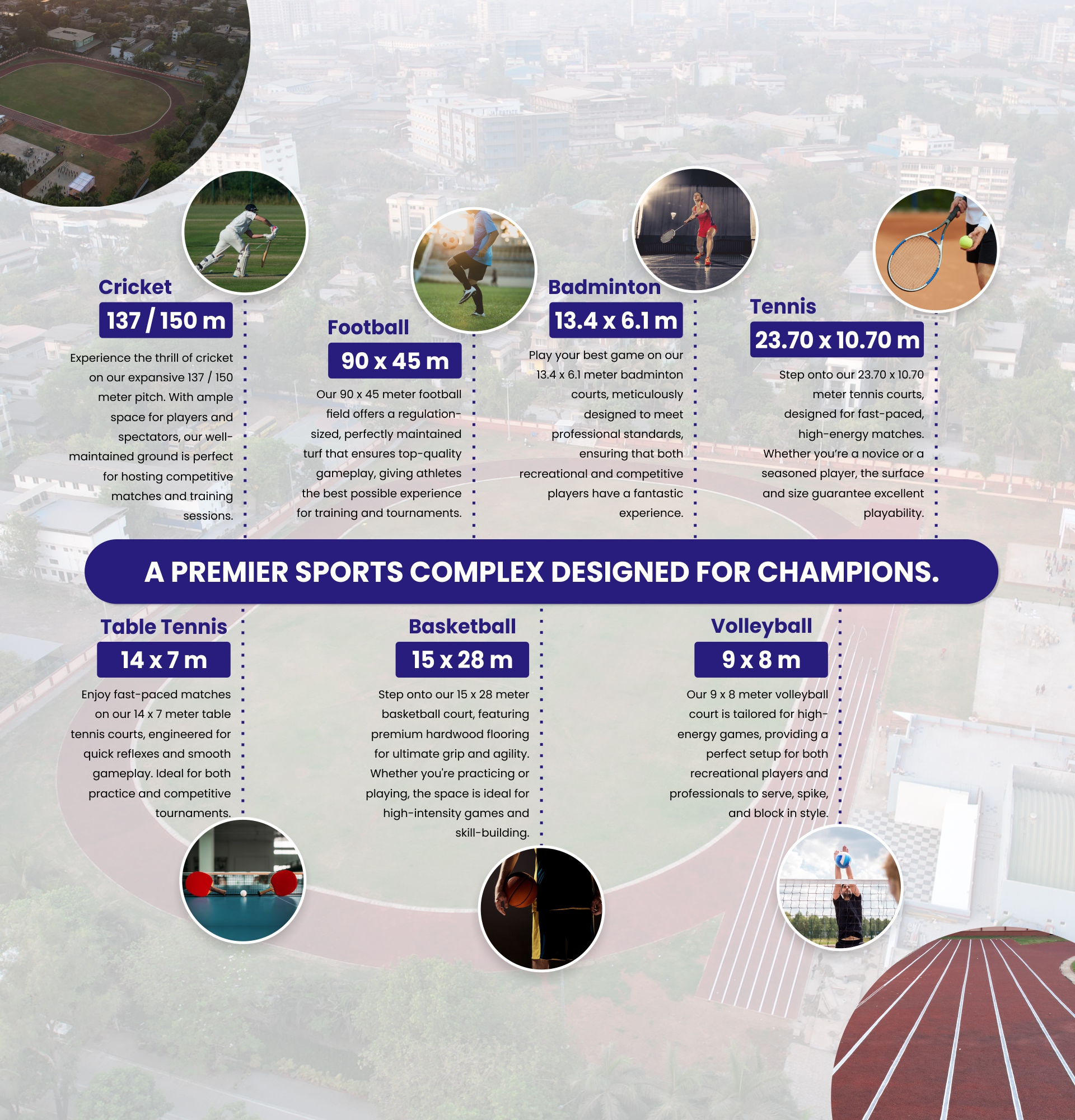 where passion meets precision and dreams take flight! Situated in the heart of Milap Nagar, MIDC, Dombivli East, our state-of-the-art facility spans an impressive 23,405 square meters. Here, we are dedicated to nurturing talent, honing skills, and fostering a culture of sportsmanship and excellence.